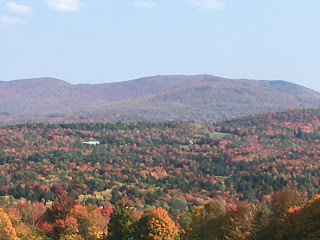 This is the Missisquoi River. It is older than the Green Mountains (northern Appalachians) dating to 375 million years ago, 25 million years before the mountains rose up. How can that be? It just kept on flowing along while mountains pushed up beneath it like someone sliding into bed under a sleeping cat.Three weeks ago as we drove south from Montréal the forest was green except for the maples that had turned red. Now the mountains are quilted in red, yellow, purple and orange. The pale purple aster is a perfect offset to the fall trees.