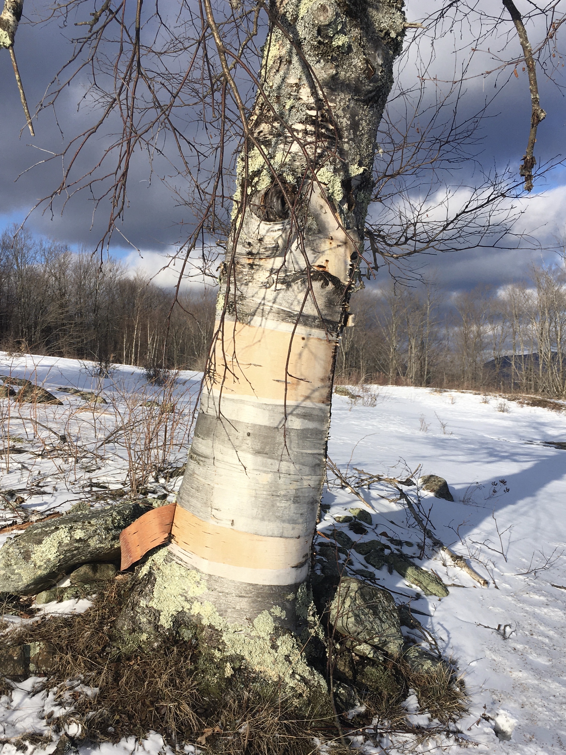 Something, probably a deer, has been at the bark of this tree. It stands alone by a pile of stones cleared from the meadow for farming, probably a hundred years ago, or more. I like the totem-pole raven's face; I didn't see it until I saw the photo.